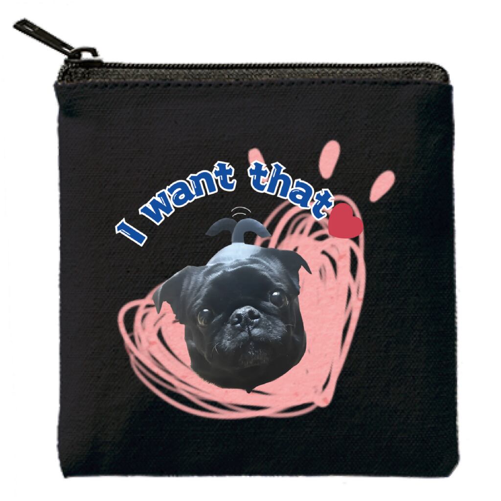 【キャンバスフラットポーチ♪黒パグ①I want that♡】ブラック ~BrainSpark Dsign & More~